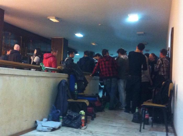 So I went to the MB with several friends and bought some beer. I never thought I would see such thing in my dear university. People were everywhere. In front of offices, in the computer labs, in the corridors, some were even camping with blankets and sitting on the floor, some had even taken their PlayStations and attached them to their laptops. In total, there were about 200 people waiting for the academic dawn.