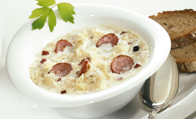 Squeeze the liquid from the sauerkraut above the pan. Now chop up the remaining cabbage in small pieces. Add this to the soup and let it boil softly for about 5 minutes. In this time you can take off the skin of the sausage and cut it into thin slices. Now put them into your soup and you’re done.
