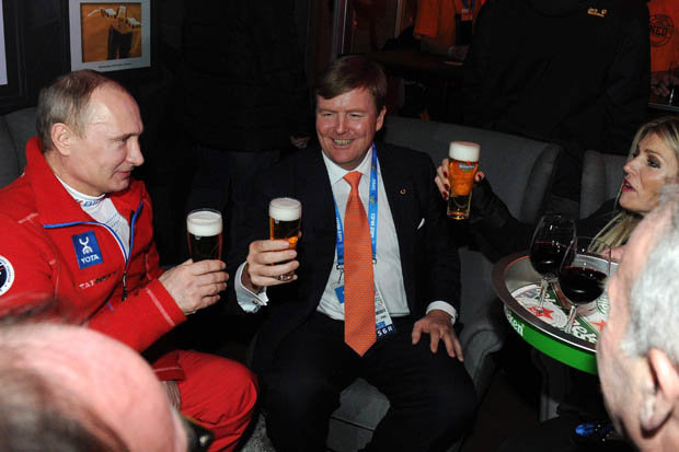 Russian president Putin having a beer with the Dutch King Willem-Alexander in the Holland Heineken House. The same president cut off quite some fans and athletes during the Olympics.